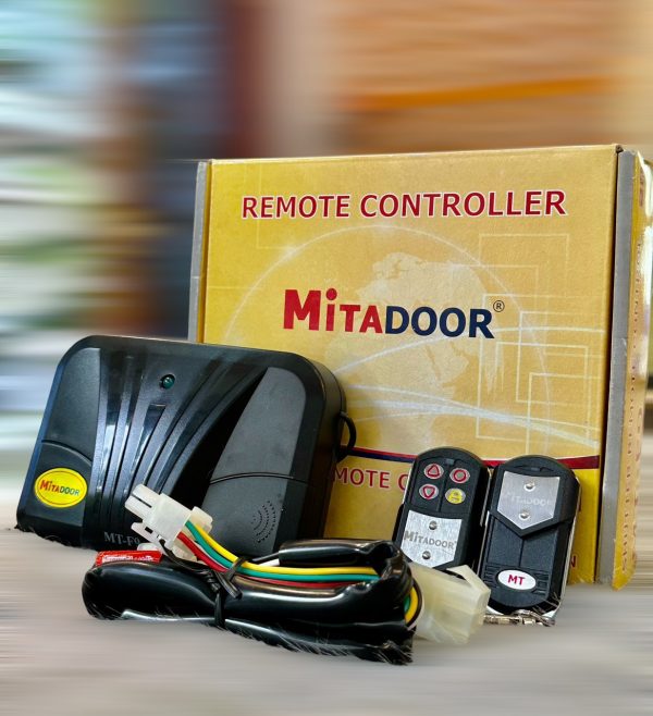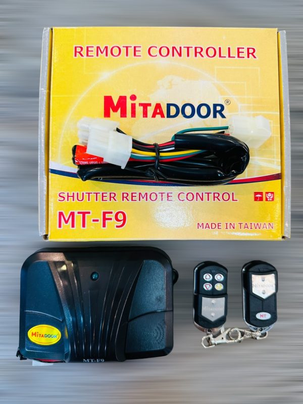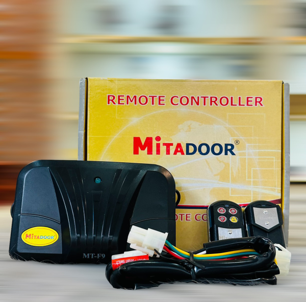 Nguyên hộp điều khiển cửa cuốn MitaDoor MT-F9Bộ điều khiển MitaDoor MT-F9 gồm 01 hộp nhận tín hiệu, 02 remote điều khiển từ xa, 01 dây nối đồng bộ với motorBộ điều khiển MT-F9 tem vàng phay nhôm xước tinh xảo