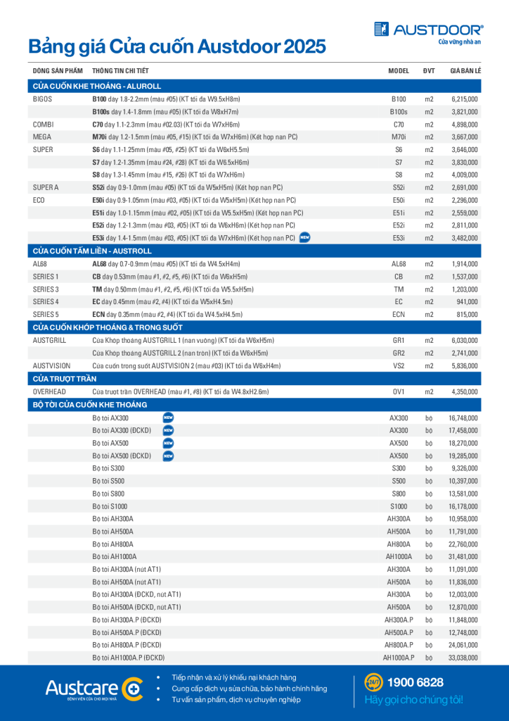 Bảng giá cửa cuốn Austdoor 2025